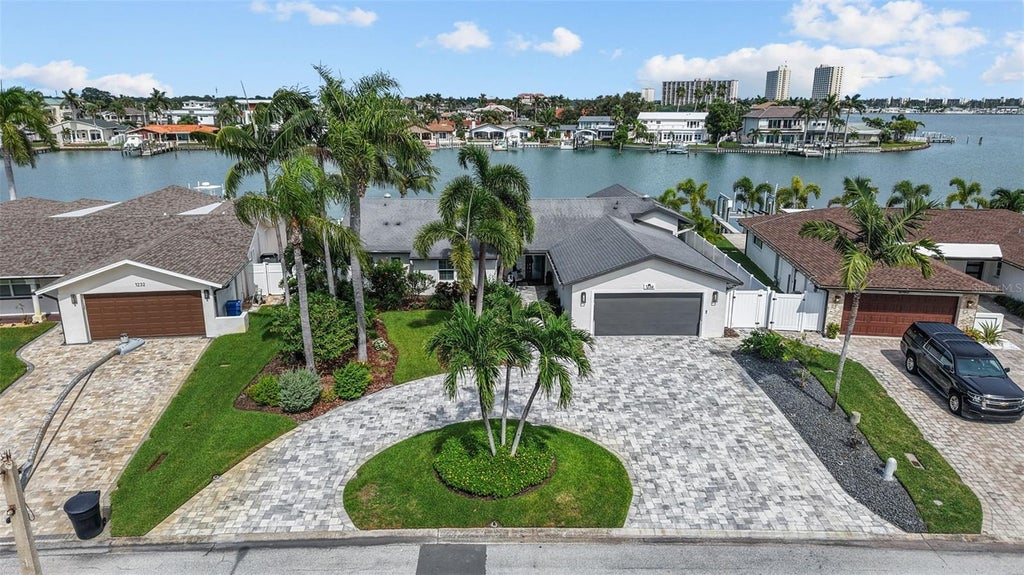 LIVE ABOVE IT ALL – ELEVATED WATERFRONT LUXURY! This 4 bedroom 3.5 bath home with EXTENSIVE HIGH-END UPGRADES sits on a HIGH LOT WITH NO FLOOD WATER INTRUSION TO THE HOME OR GARAGE (updates completed prior to Hurricane Helene). Walls of hurricane impact glass frame sweeping open Intracoastal views beneath soaring cathedral ceilings, with new hurricane shutters adding storm protection and helping keep the home cool while you travel. The chef’s kitchen offers Wolf and Bosch appliances, quartzite counters, wine storage, hidden walk-in pantry, and natural gas cooking. Dual waterfront suites include spa baths, custom closets, and direct access to the saltwater pool and spa. Updates feature a new high seawall, HVAC, tankless water heater with recirculating pump, reverse osmosis system, plumbing upgrades, full-house generator, newly paved driveway, and natural gas service. Outdoor living includes a summer kitchen, fire pit, rain-curtain pool entry, lush landscaping, and composite dock. This DEEP WATER LOT PROVIDES 83 FEET ON THE WATER WITH A 13,000 LB BOAT LIFT, KAYAK AND PADDLEBOARD LAUNCH, AND PLENTY OF SPACE FOR ADDITIONAL WATERFRONT TOYS. Situated in one of the most coveted waterfront communities in Pinellas County, just one mile from the beach, restaurants, entertainment and more. You will feel right at home in this friendly community of Yacht Club Estates.